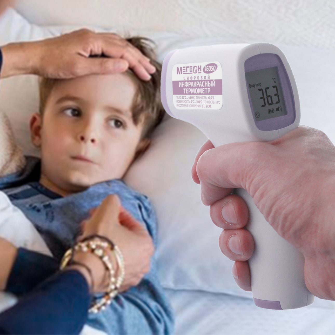 МЕГЕОН 16050 - бесконтактный термометр (градусник), который предназначен для работы в бытовых условиях. Термометр имеет возможность выполнять с высокой точностью измерения температуры поверхности кожи человека в диапазоне от 32°С до 42,9°С и продуктов питания и воды в диапазоне от 0 до 100°С. Прибор имеет функцию звуковой сигнализации превышения температуры с возможностью изменения порога звуковой сигнализации. Термометр также имеет встроенную память на 32 измерения. Также термометр оснащён функцией автоматического отключения, что в свою очередь значительно экономит заряд батарей. Прибор имеет встроенный датчик температуры корпуса, что позволяет значительно повысить точность и стабильность измерений. Функциональные возможности позволяют проводить корректировку поправочного значения смещения. Для работы при плохом освещении предусмотрена подсветка дисплея. Простота настройки и эксплуатации не потребует какой-либо технической подготовки.Таким образом бесконтактный инфракрасный термометр (пирометр) МЕГЕОН 16050 станет незаменимым помощником в быту и значительно упрости измерение температуры детей.