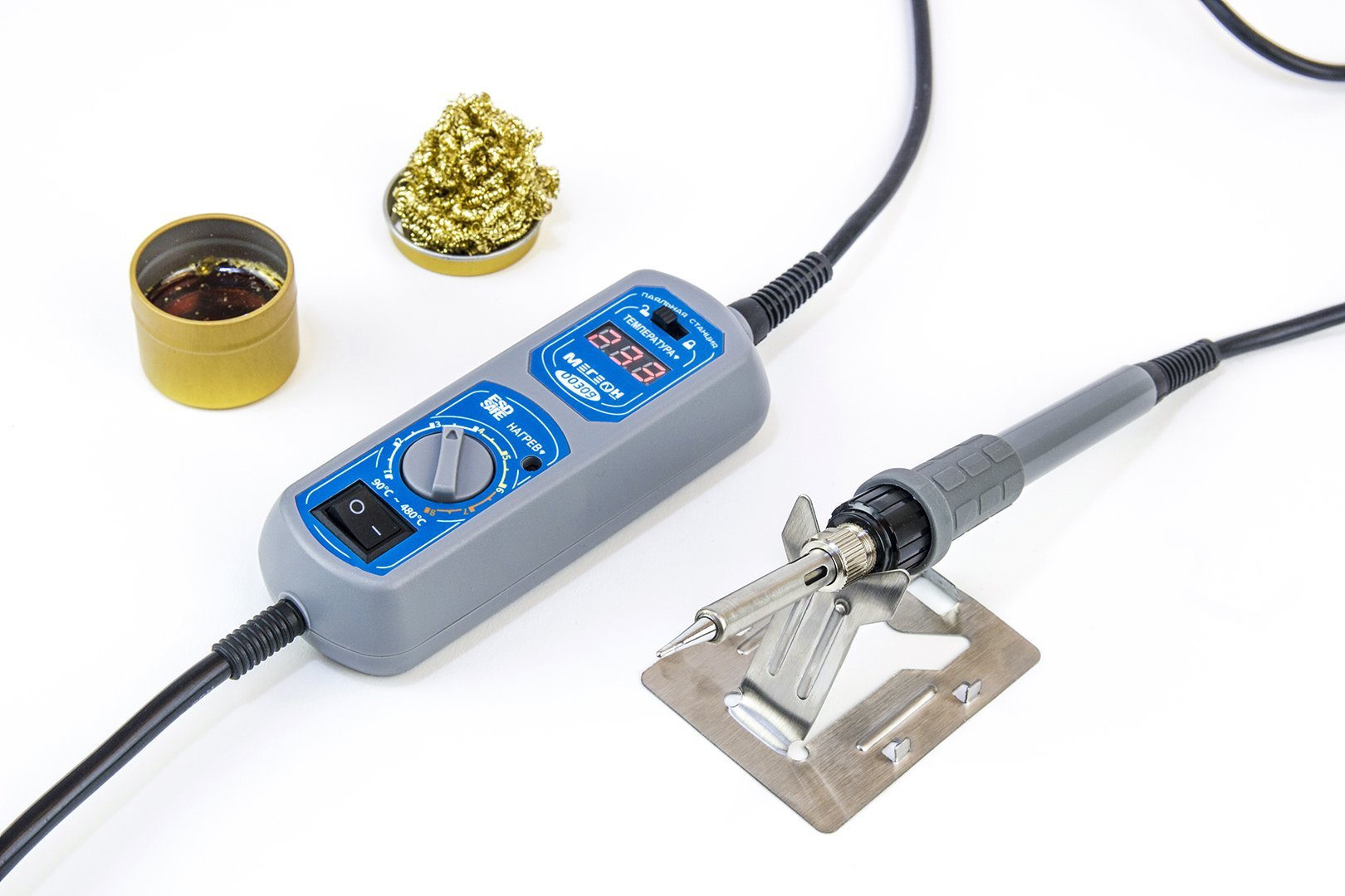 МЕГЕОН 00309 это удобный паяльник с цифровым управлением температурой. Немаловажным преимуществом при работе с паяльником является маленький вес и быстрый нагрев, точное поддержание температуры. Большое количество сменных наконечников разной формы (в комплект не входят). Яркий светодиодный дисплей и удобный регулятор для установки. В комплекте удобная металлическая баночка с канифолью и очистителем наконечника.